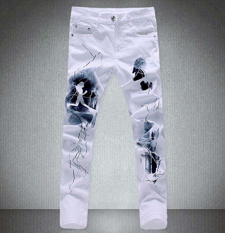 2020 2015 White Printed Men Jeans Unique Lighting And Running Man Printing Cotton Large Size 44 Skinny Jeans For Men Denim Pants Nnk1020 From Alag 28 95 Dhgate Com
